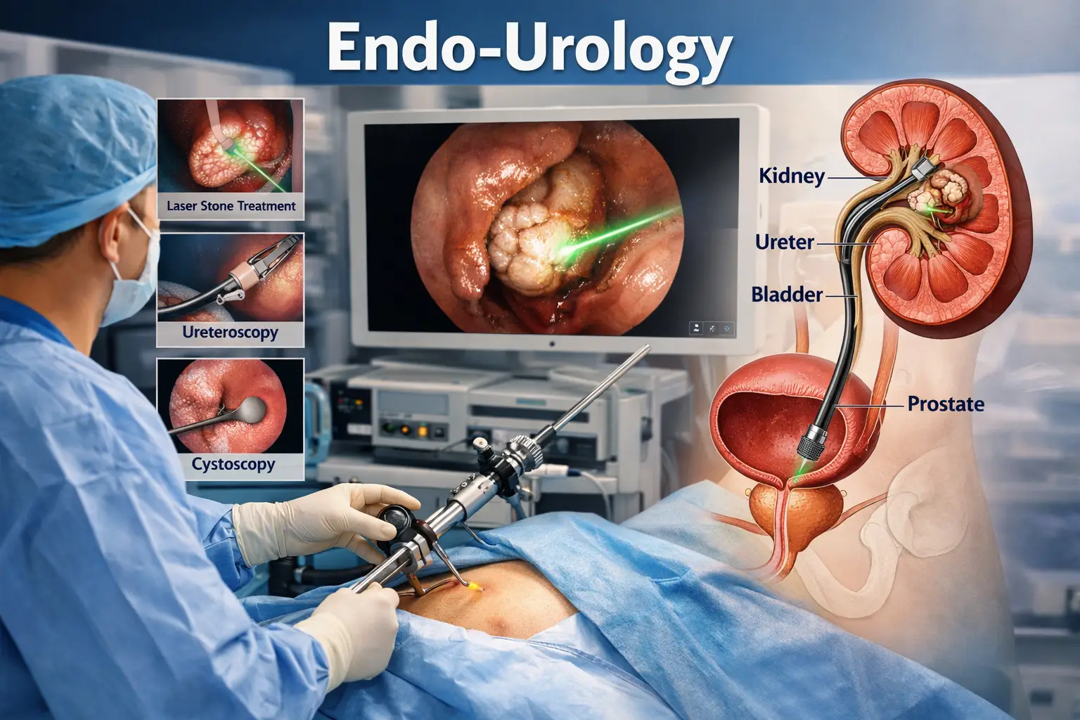 Minimally invasive endoscopic treatment for kidney stones, ureteric stones, bladder stones, prostate enlargement, and urinary tract obstruction using modern techniques like PCNL, RIRS, URS, and laser procedures.