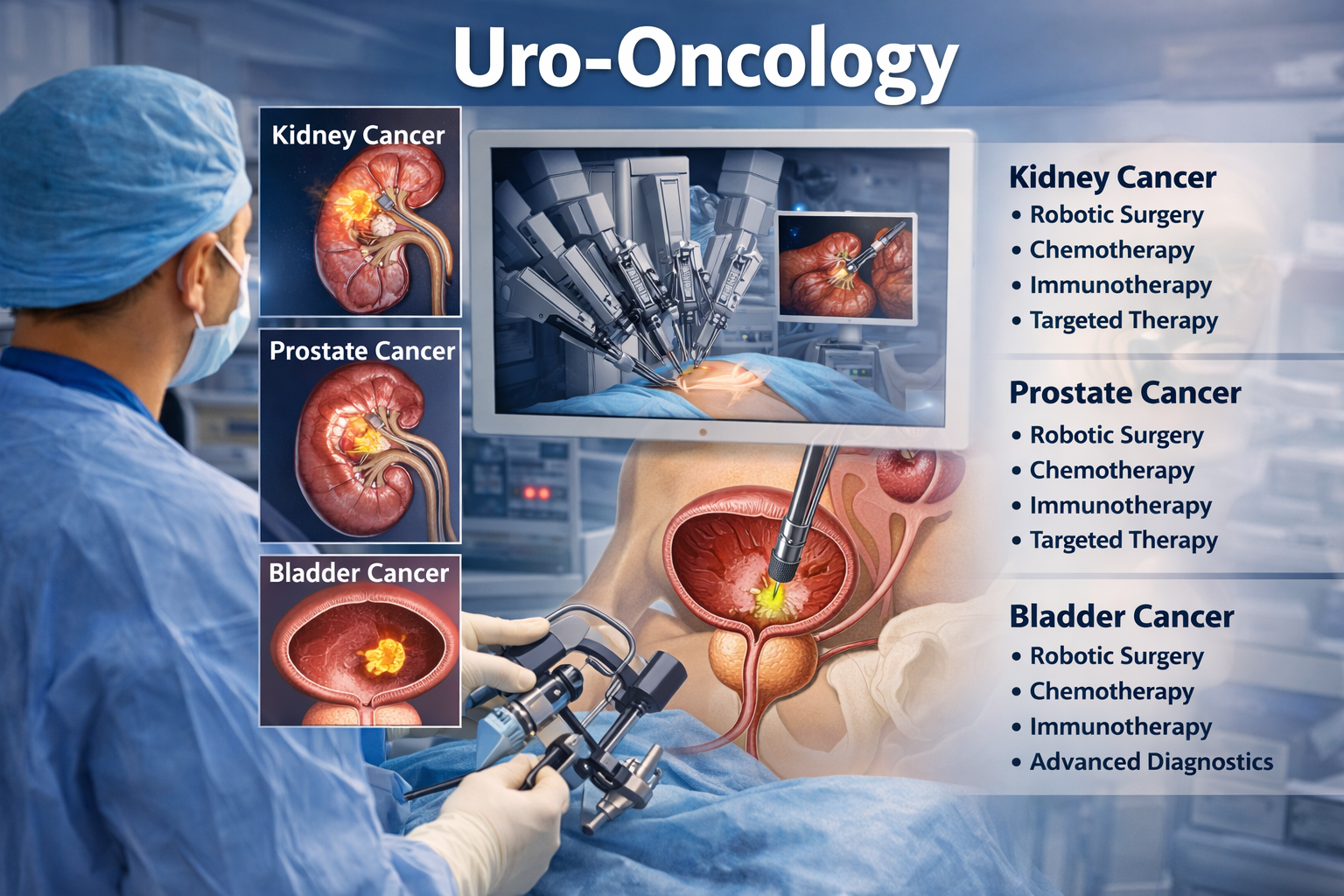 Diagnosis and surgical management of urological cancers including kidney cancer, bladder cancer, prostate cancer, and testicular tumors, with a focus on organ preservation and modern treatment protocols.