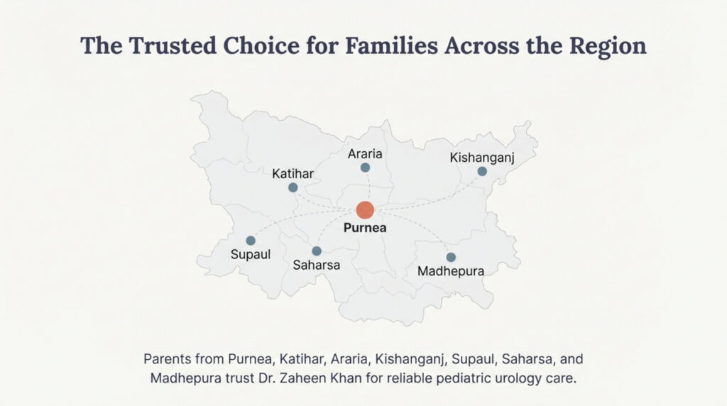 Parents from Purnea, Katihar, Araria, Kishanganj, Supaul, Saharsa, and Madhepura trust him for reliable pediatric urology care.