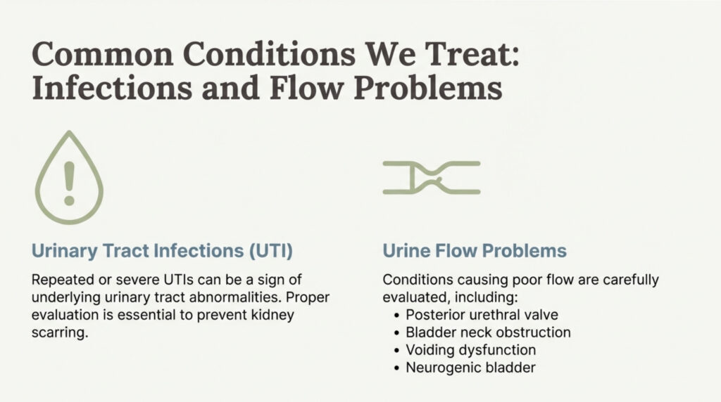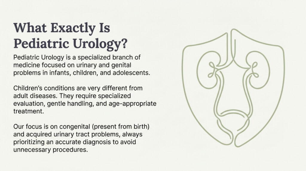 Pediatric urology deals with congenital (present from birth) and acquired urinary tract problems in children. These conditions are very different from adult urological diseases and require specialized evaluation, gentle handling, and age-appropriate treatment.