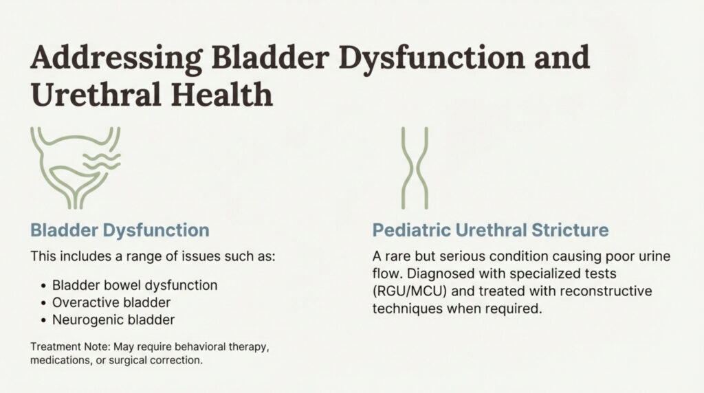 Conditions such as posterior urethral valve, bladder neck obstruction, voiding dysfunction, and neurogenic bladder are carefully evaluated.